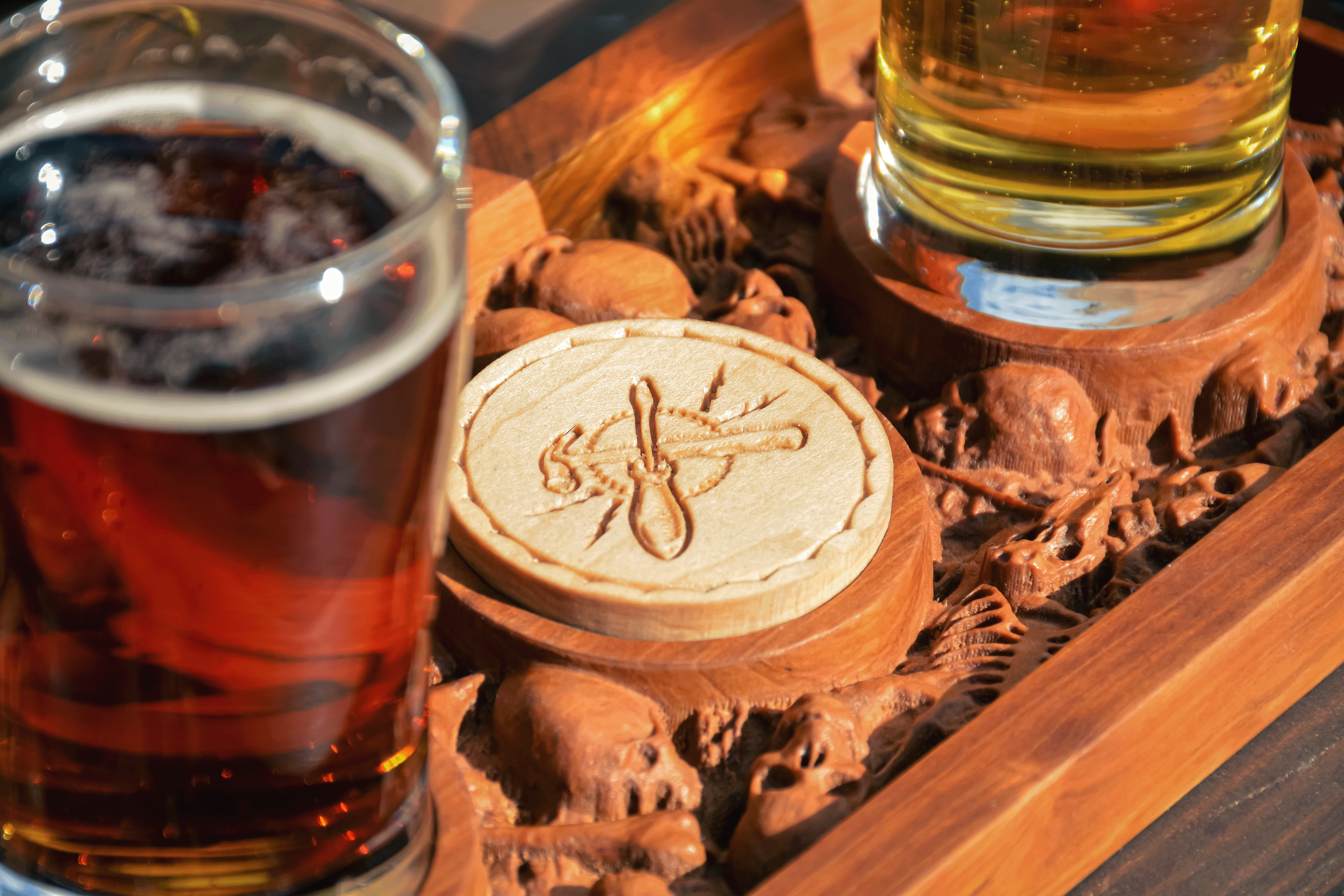 Our custom designed beer flight features stunningly beautiful 3D sculpting, the latest cutting-edge CNC relief carving techniques, and a blend of tried and true woodworking craftsmanship that is always exceptional.